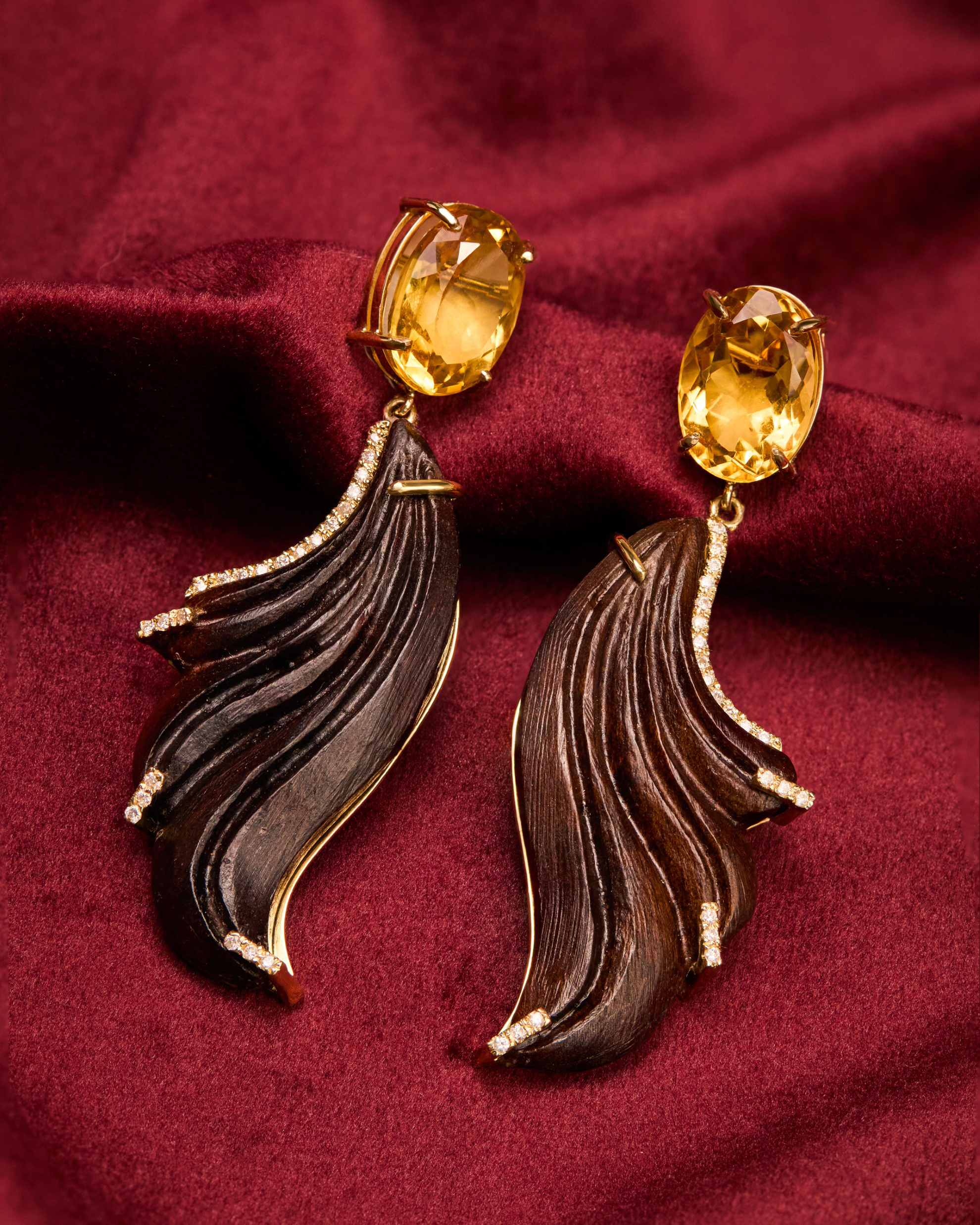 Brinco esculpido à mão em madeira Ipê de arte sacra, combinado com Citrino em lapidação oval totalizando 9,9 ct. Ouro amarelo 18k e Brilhantes brancos totalizando 0,22 ct.