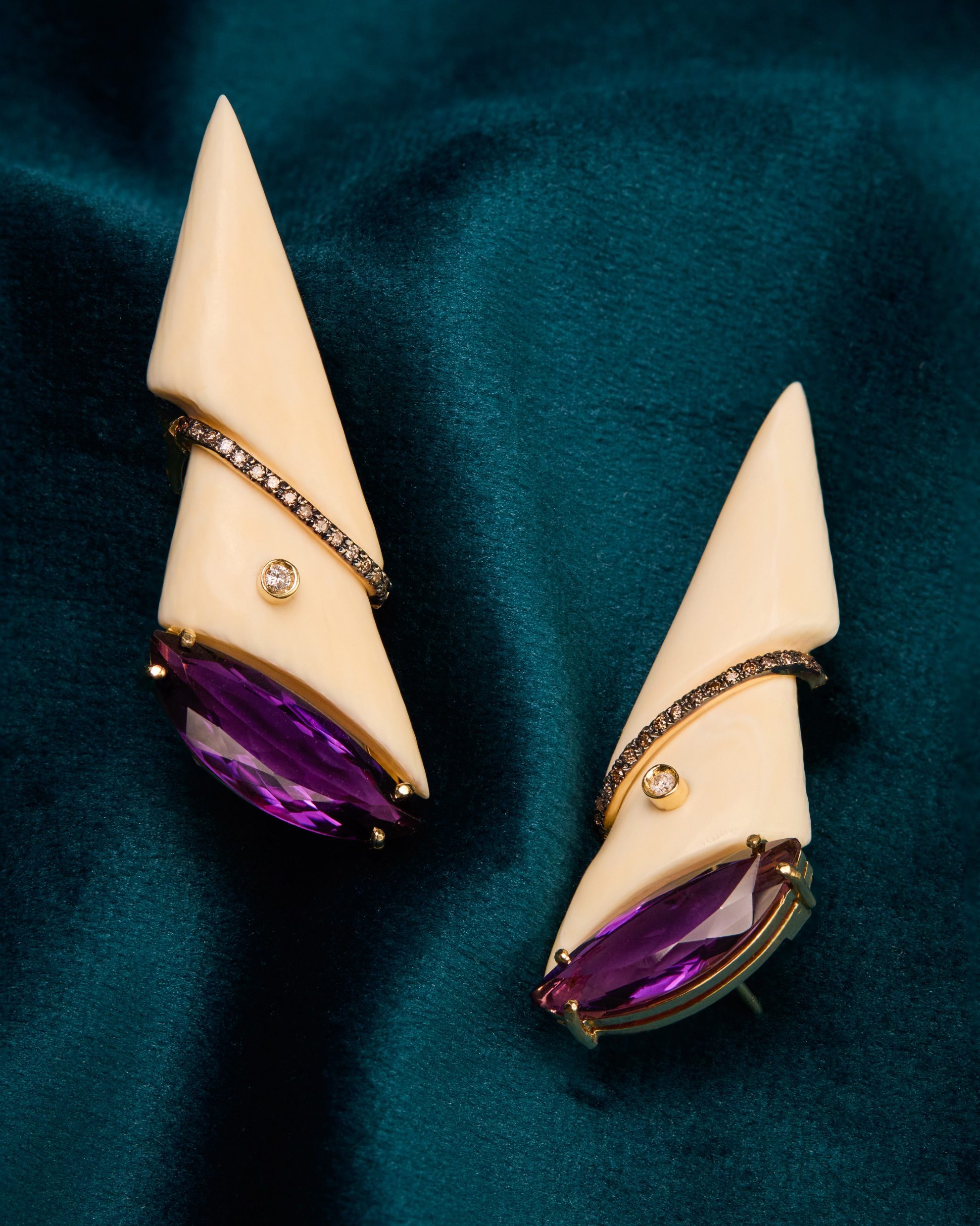 Earcuff com marfim do século XIX e ametista em lapidação especial com 30 ct. Em ouro amarelo 18k, brilhantes brown e brancos totalizando 0,18 ct. A peça pode ser usada com pendente.