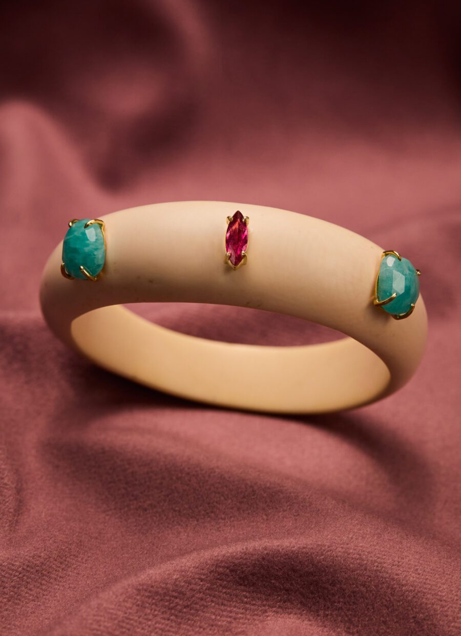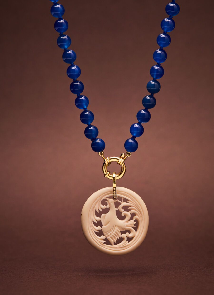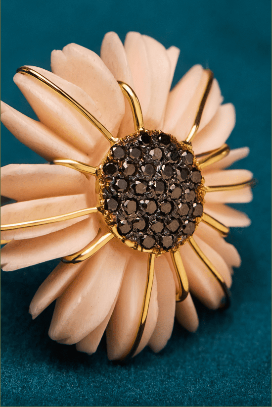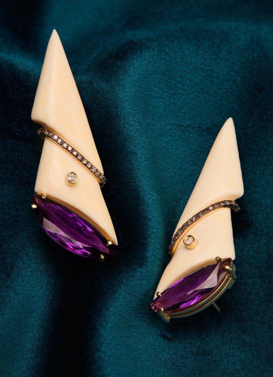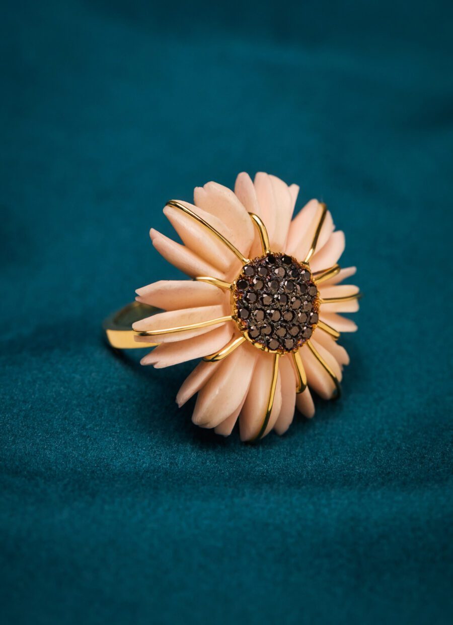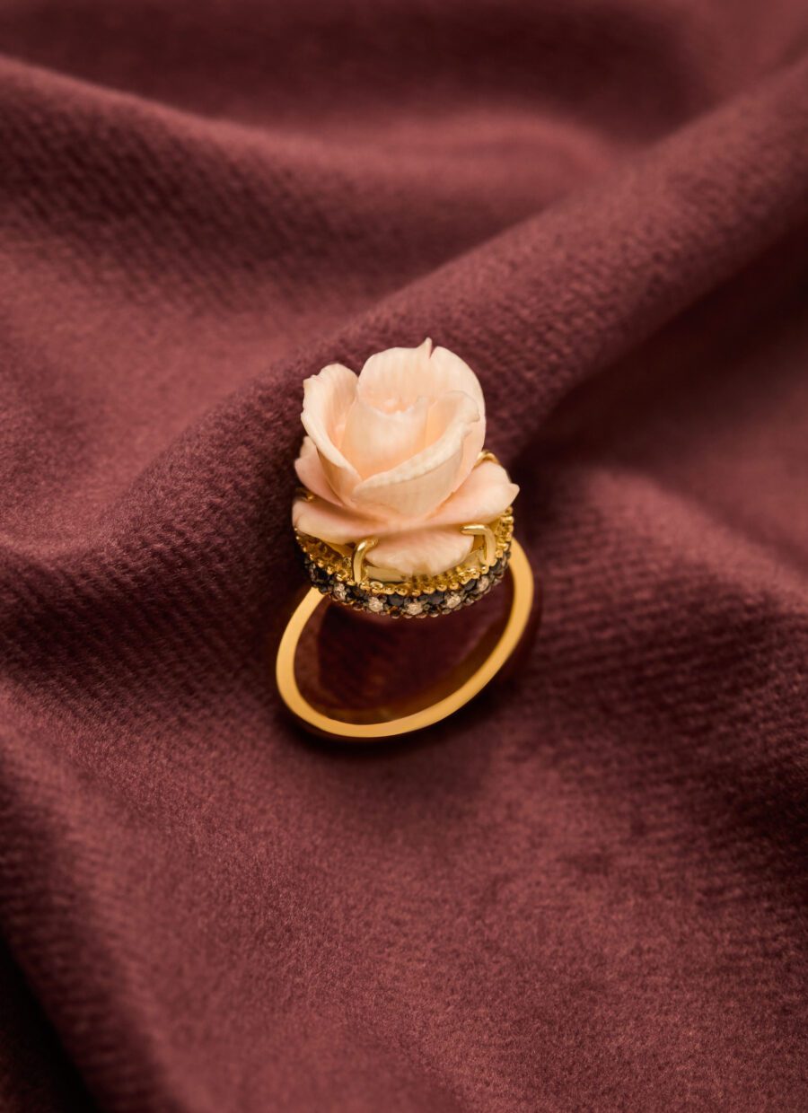 O marfim e o coral despertam camadas de história, lembranças de vida cristalizadas em formas que se deixam sentir. Criar cada joia é ouvir o que a natureza já sabia, traduzindo textura, cor e tempo em peças que habitam o corpo e a imaginação.